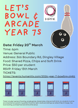 Please note: Ticket Includes 1 game of bowling, arcade games, shared pizza, chips and soft drink. ALL students must be accompanied by a parent or guardian the entire night. Adults and siblings can attend free of charge, and may book bowling and purchase food and drink at the venue.