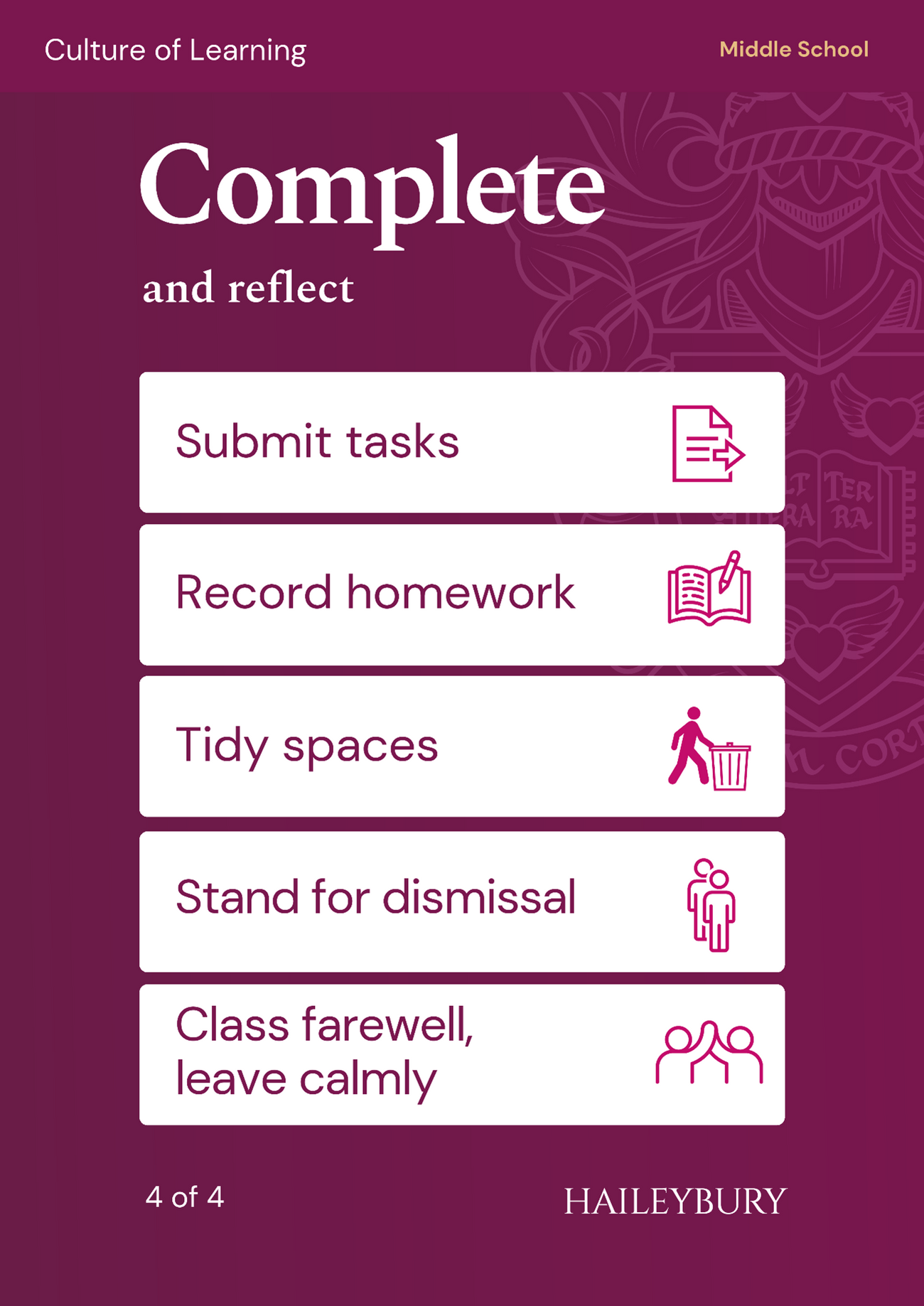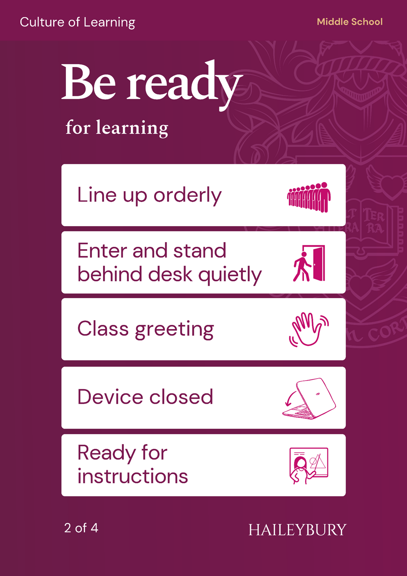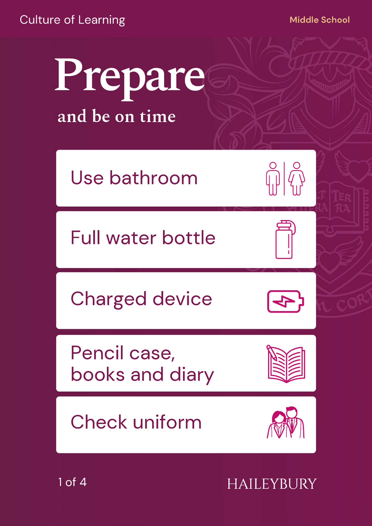 Our students being ready, prepared, engaged, completing their routines and being reflective are the cornerstones of our Culture of Learning and we continue throughout the year to support and educate the students in how to be the most successful learners they can be.