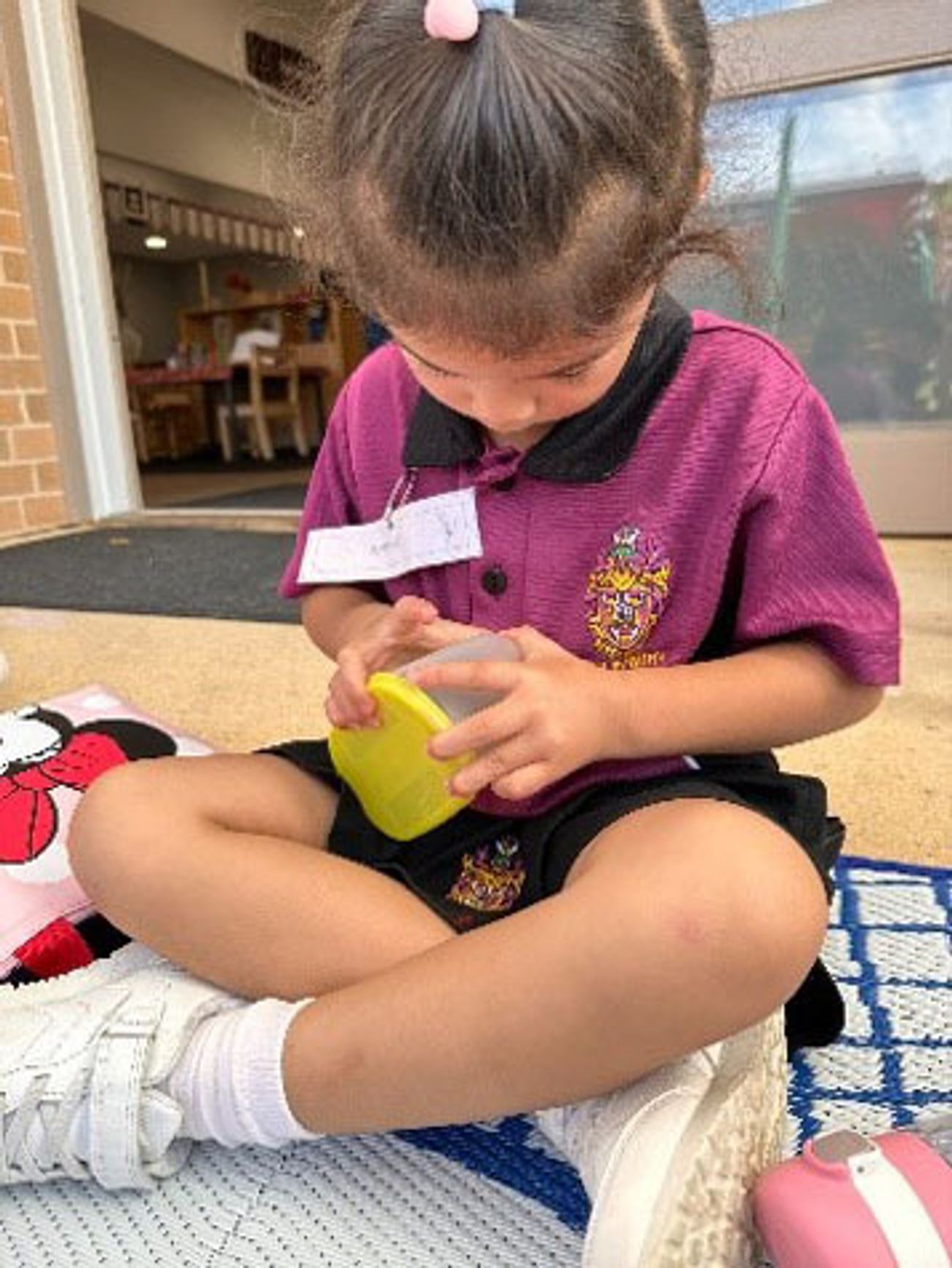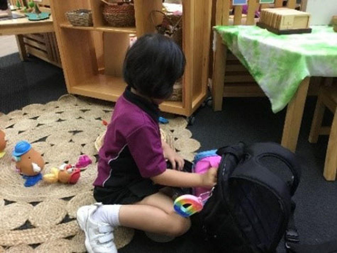 Educators are having discussions with the children about the importance of following the group plan on arrival. This encourages children to take care of their belongings, pack away their own school bag, say goodbye, and sit on the mat for their morning meeting.