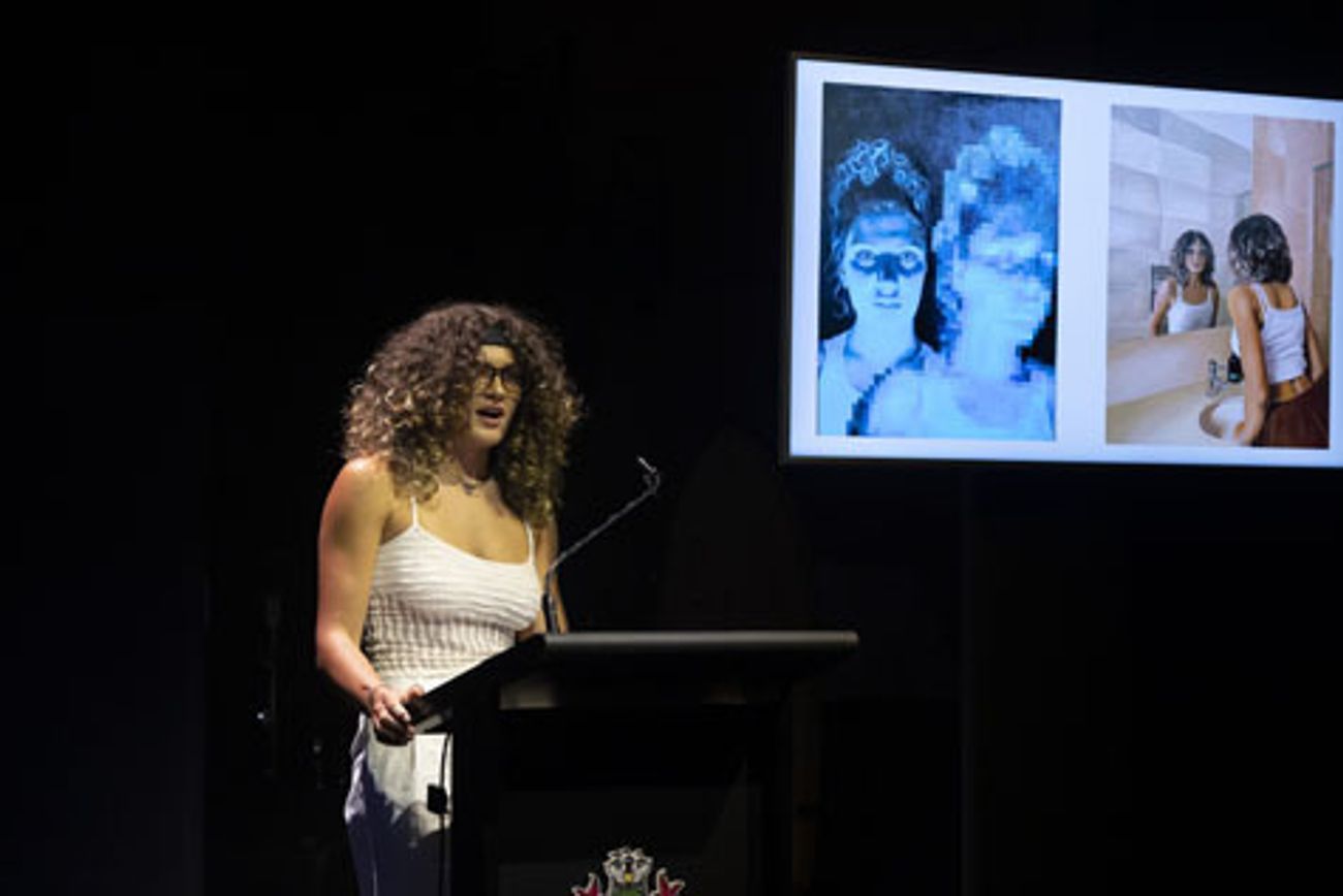 Representing the Visual Arts through presentations of their final works were Ashley Tonelli (Studio Arts), LiahLiao (Visual Communication Design), Jacob Anderson (Media), and Bailey Yates (Product Design and Technology). It was wonderful to see so many current students in the audience being inspired by these accomplished artists, directors and designers.