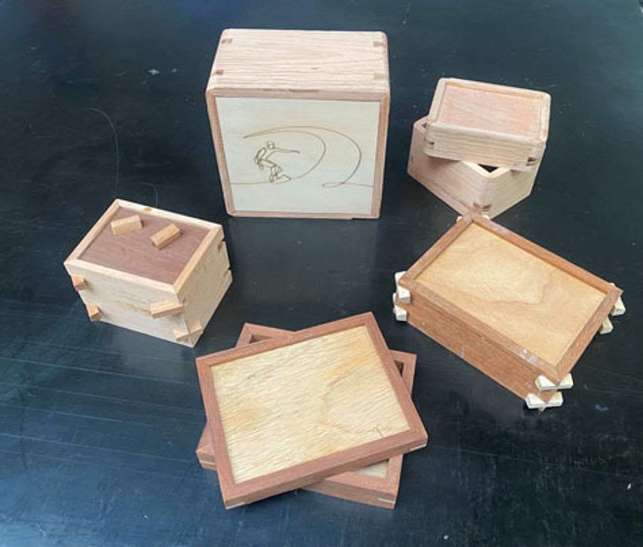 To individualise their box designs, students use decorative techniques including intarsia, fret work, inlay and pyrography that combine hand woodworking skills and laser technologies. Students then apply the design process to re-design and develop a sustainable lamp as their main Unit 1 folio and production task.