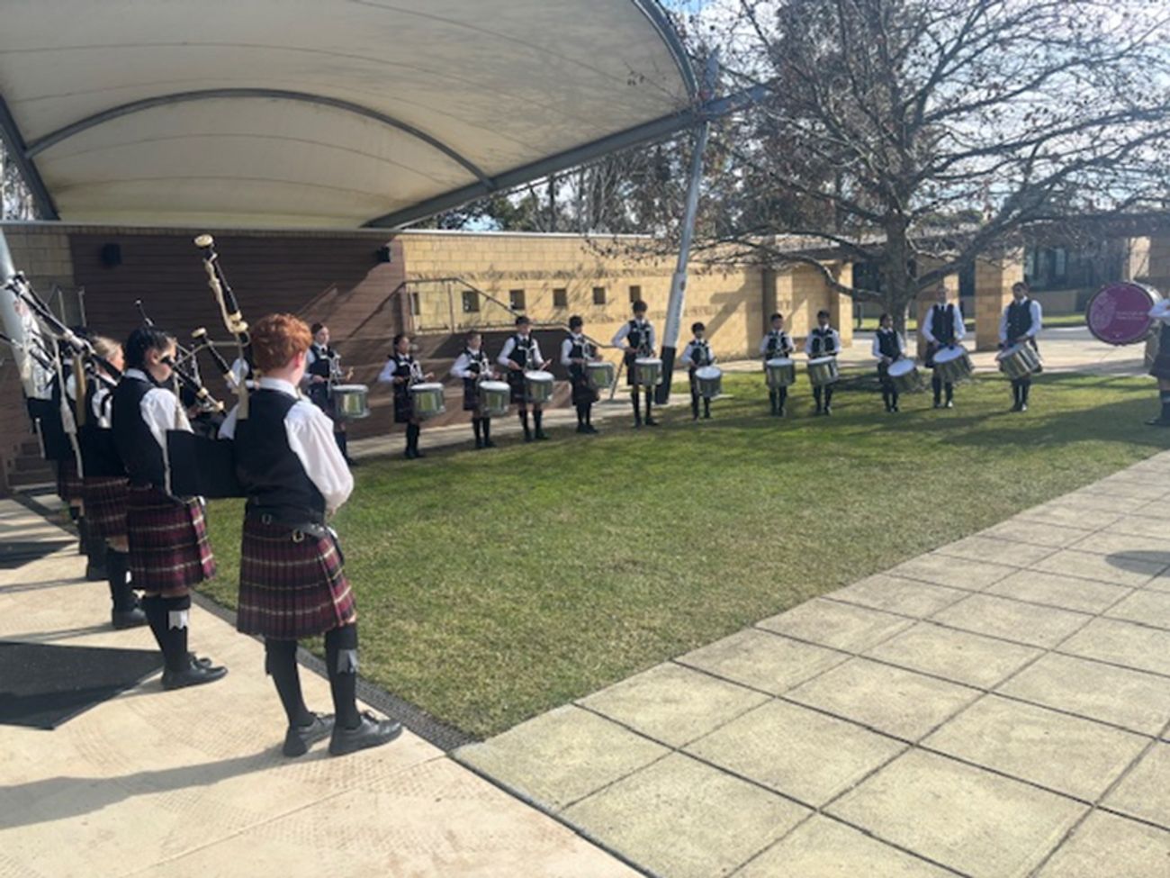 This month, the Pipes & Drums also performed for the boys and girls Haileybury Firsts Football Teams, when the Year 12 students played their final home game of the season. The Pipes and Drums performed in a guard of honour as the teams entered the ground. It was a pleasure for them to be involved and perform on this special occasion.